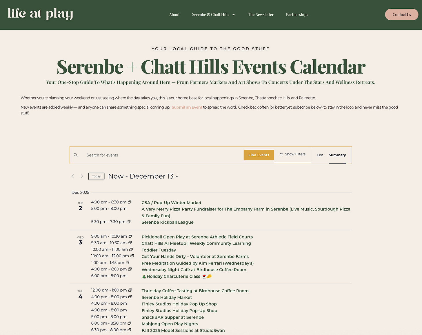 Browse or subscribe to the calendar anytime at lifeatplay.co/events. Add your own events if you’re hosting something worth sharing – submit here.