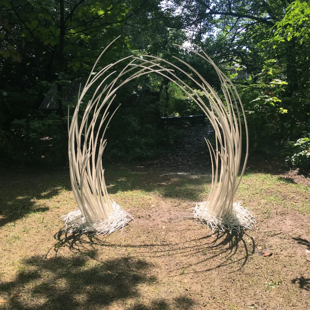 Methods of Embrace is an immersive porcelain installation by Serenbe-based artist Rachel K. Garceau. Inspired by the architecture of the bowerbird — a creature known for building intricate passageways to attract a mate — this piece explores what it means to move through an enclosure, a transition, or a moment of personal shift.